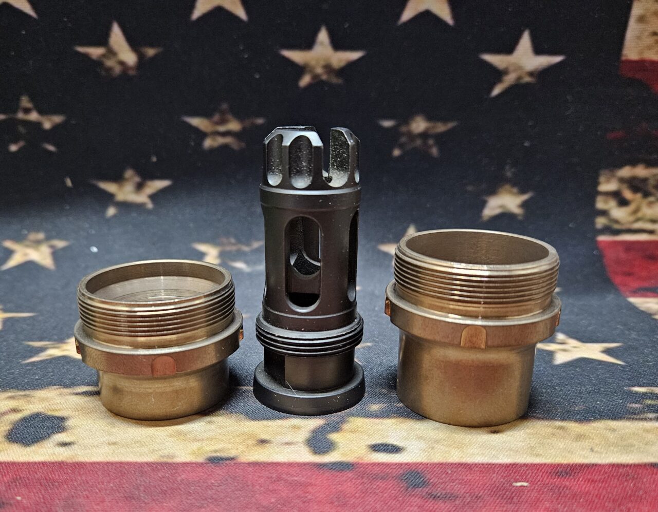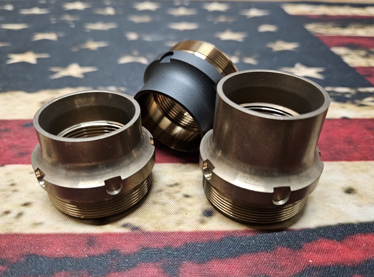 These 1.375-24 Bravo (“ASR”, H.U.B.”) long or extra long Griffin taper mount (“Plan A” pattern) adapters protrude .7″ or 1.0″ behind the rear face of the suppressor, giving an extra ~1/2″ or ~3/4″ of muzzle device clearance versus a typical adapter that has a .2-.25″ thick flange.